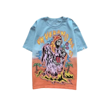 The Warren Lotas x Bad Bunny Un Verano Sin Ti Ombre Tee fuses grunge-heavy streetwear with tropical heartbreak. Featuring Lotas’ signature hand-drawn, skull-meets-flame style mashed with Un Verano Sin Ti motifs—think sunsets, hearts, and sadness—the graphic lands loud on a sun-faded ombre wash that transitions from light to dark like a summer slipping away.